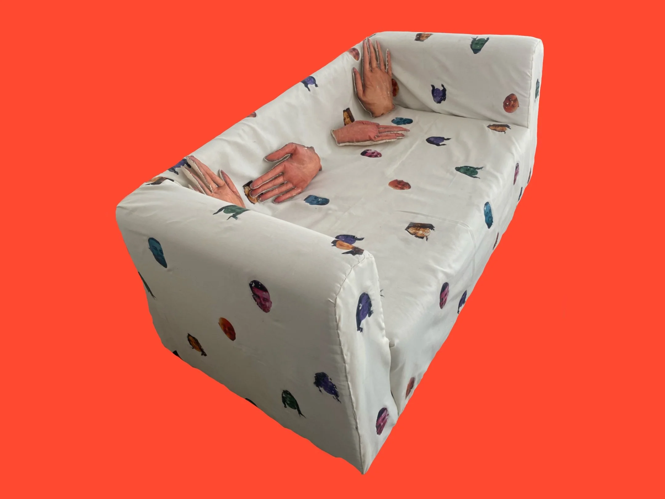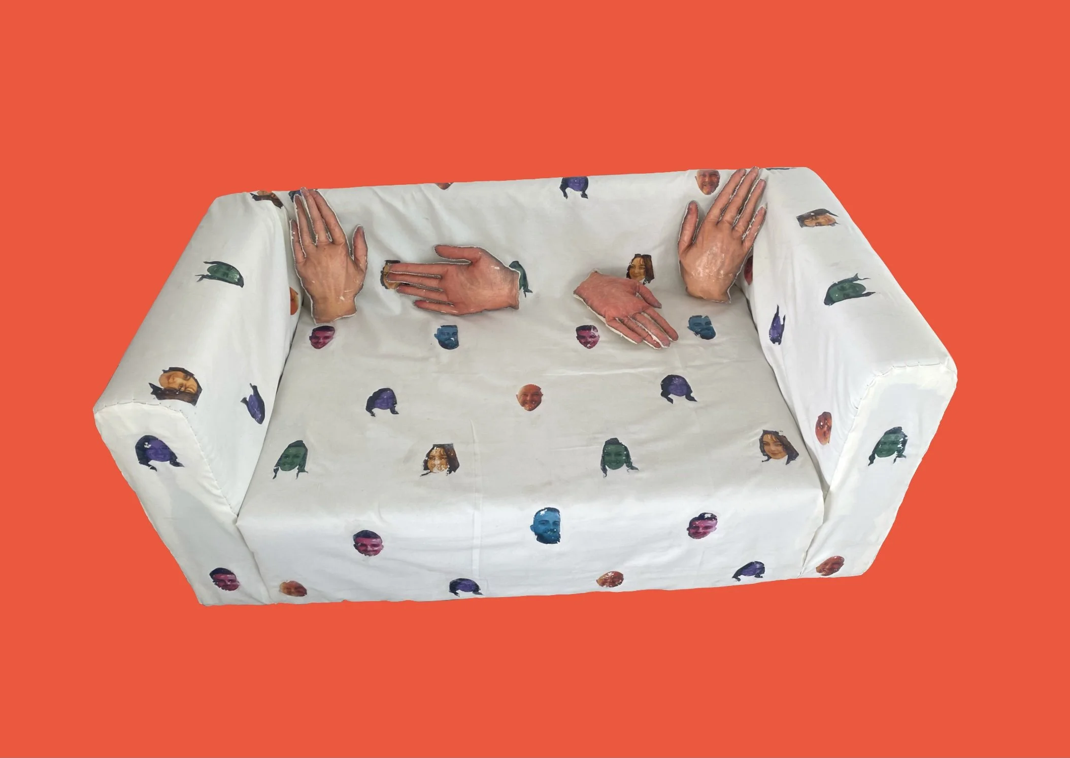 Blurring borders between interior design and contemporary art, ‘POLKA-DOTS AND PALMS’ is a sculptural piece imbued with links to childhood and family. An upholstered couch contains image transferred polka-dot patterns of my family's faces, and is presented with pillows of my own hands specifically. The work aims to challenge the functionality of object and space, explore the relationship between the body and sculpture, distort the familiarity of dwellings, and through intervening with objects meticulously, raise questions regarding the personification of objects, and the attachment of memory to objects.